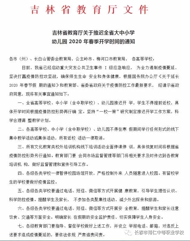 根据省委省政府有关文件精神,为加强疫情防控工作,确保广大师生生命安全和身体健康,全市中小学(幼儿园)开学时间延迟,具体开学时间另行通知。
